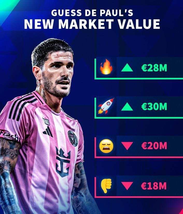 直播吧9月12日讯 德国转会市场宣布,将在9月12日更新美职联球员的身价,并预告了今夏加盟迈阿密的德保罗。